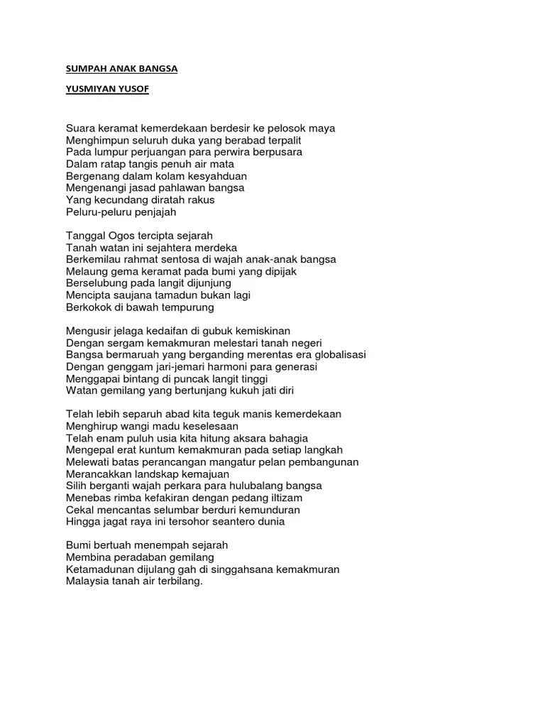 • rima akhir pantun ialah a,b,a,b sajak sumpah anak merdeka. 2016 uniten) (dua baris pertama ialah pembayang dan dua baris kedua ialah maksud).